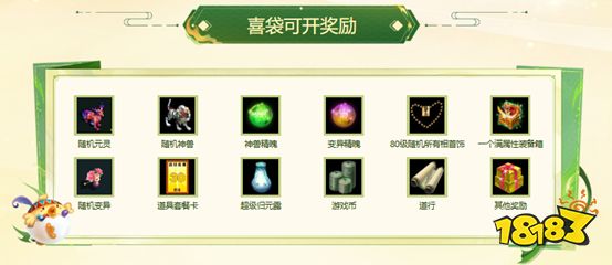 本次活动中,喜袋是玩家们获取丰厚奖励的重要途径之一。喜袋中藏有丰富的奖励,包括随机元灵(元灵种类包括赤天、混沌、笛舞、降魔、夫诸、震魃等)、随机神兽、变异、神兽精魄、变异精魄、满属性装备箱、80级随机所有相首饰、道具套餐卡、商城道具、道行、游戏币等。但本月从喜袋中获得的道行奖励达到500次上限后,再使用喜袋开出道行奖励时将自动转换为经验奖励。