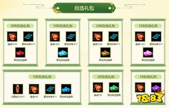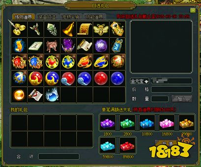 玩家可以根据自己的游戏需求,选择自选礼包商城里的物品,自由搭配同种类的道具,只要所选道具的价值满足相应“自选礼包类型”的要求,当价格达到1800元宝、2800元宝、10800元宝等不同档次时,就可以将所选道具打包成相应的礼包,并且还能获得相应的赠品。