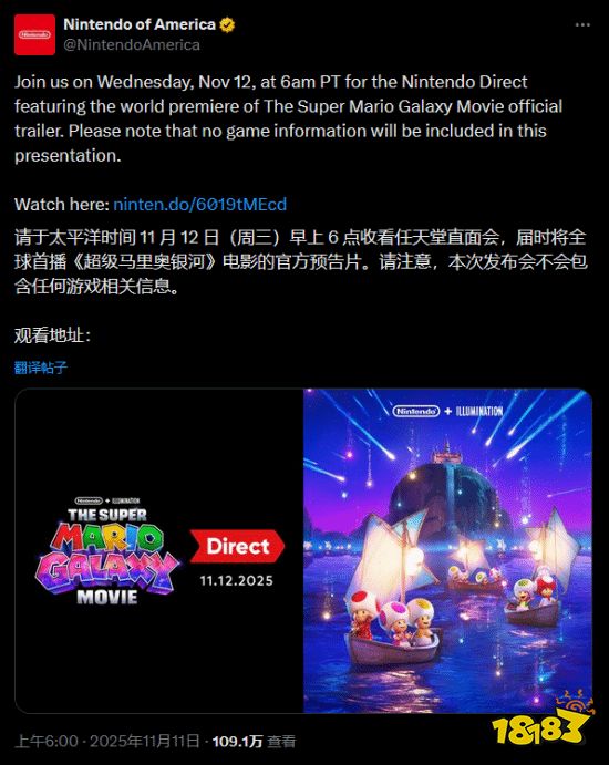 任天堂表示,本次直面会将会在北京时间11月12日晚上10点进行,不会展示任何与游戏相关的内容,将公布《超级马里奥银河大电影》的首支预告片。