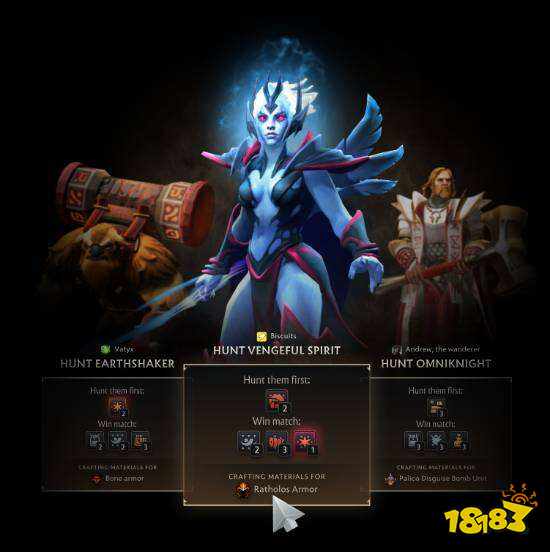 在每场Dota比赛开始时,你可以选择一名敌方英雄,作为狩猎的目标。不同的英雄会奖励不同的打造材料。每个潜在目标都会列出材料以及这些材料用来打造的套装。可以根据接下来要打造的套装来选择提供特定材料的目标。如果赢下比赛,将会获得列出的所有材料。如果失败,只会获得其中的一部分。