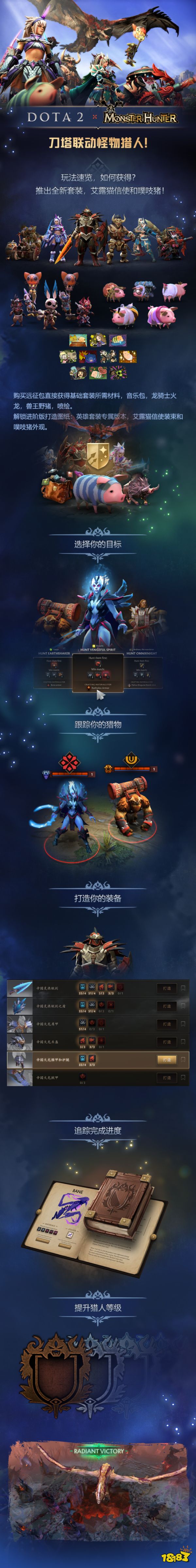 近日,DOTA2迎来了历史性更新:宣布与卡普空旗下的《怪物猎人》开启跨界联动。玩家可通过收集材料免费制作六位英雄的怪猎主题基础铠甲套装、艾露猫信使,还可以购买远征物品包来解锁更多奖励——怪物猎人音乐包、噗吱猪宠物、兽王的野猪、龙骑士的酷炫火龙形态,还可以打造这六位英雄更多特效加成的多个专属版本饰品。活动玩法也参考了怪猎的狩猎模式,玩家可以通过游玩比赛击杀特定英雄来获取饰品打造材料,在局外打造你想要的饰品。