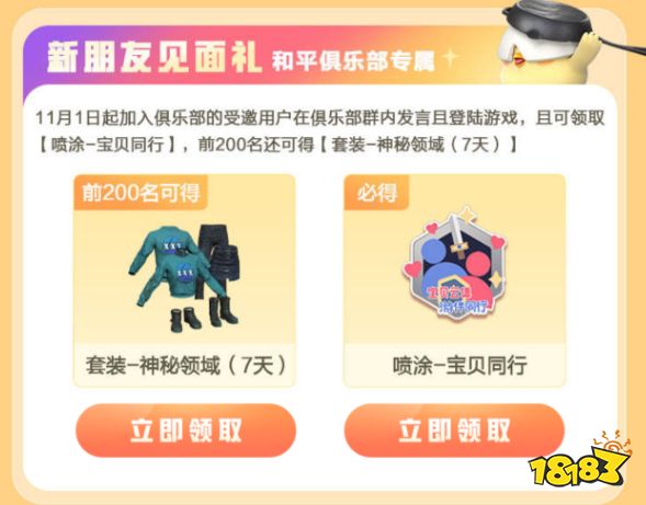 11月1日起来心悦俱乐部App,加入俱乐部的受邀用户在游戏家俱乐部群内发言且登录游戏,可领取【喷涂-宝贝同行】,前200名还可以得【套装-神秘领域(7天)】;