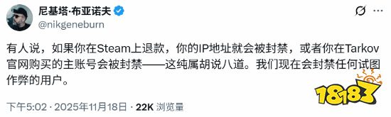 面对不断发酵的争议,制作人尼基塔(Nikita Buyanov)今日在官方账号上罕见强硬发声,直接回怼传闻:“这纯属扯淡!我们只会封禁作弊者,不会因为退款封号。”