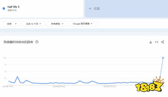 据数据追踪,截至发稿前,《半条命3》的英文关键词“half life 3”在Google搜索中的热度出现罕见暴涨。图表显示,该词条在2025年11月2日至11月8日期间热度仅为10分,但随后迅速飙升至满分的100分,足见玩家关注度之高。