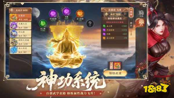 领悟神功,武学提升。少侠可以消耗指定神功书籍领悟神功,获得神功属性。并对神功属性进行修炼和融会,从而提升神功效力。需要注意的是,修炼过程中不同位置的神功属性值将进行不同幅度提升,且属性会置换。少侠若是对属性不满意可以进行多次重修,重修完成后可比较修炼结果与当前修炼结果选择是否替换。而在领悟本重神功后,少侠还可以进行“融会”,消耗指定道具对本重神功进行融会,融会后提升本重神功修炼的属性。