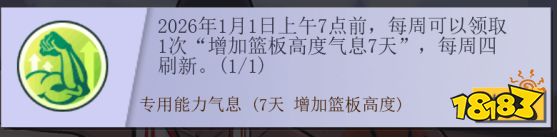 活动期间每周可以领取专用能力气息(7天增加篮板高度),让各位玩家的角色更加强力!