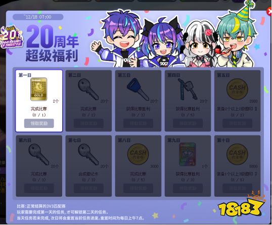 即日起至12月18日,玩家完成每天任务正常结算的3V3匹配赛即可领取20周年超级福利,玩家需要完成第一天的任务,才可解锁第二天的任务,累计可以获得10000代金券以及其他奖励。