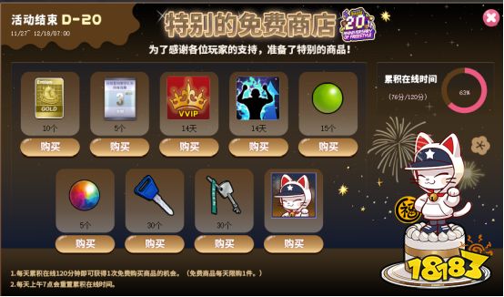 为了感谢各位玩家的支持,我们准备了特别的商品,玩家每天累计在线120分钟即可获得1次免费购买商品的机会,免费商品每天限购一件!