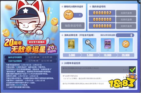 玩家可以通过消耗20周年幸运币抽取全区唯一专属号码,号码可以参与12月8日周年庆福利直播夜抽奖,奖励包括“全超特变更卡全家福”、“超特角色包”等百万礼。12月9日起玩家还可以参与个人抽奖,领取最高200万代金券奖励。