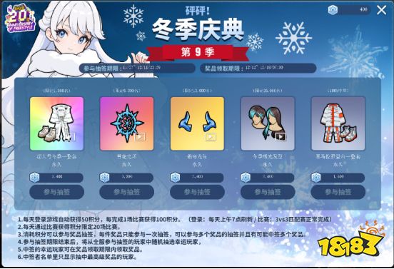 玩家每天通过比赛以及登录可以获得积分,消耗积分可以参与奖品抽签,每件奖品只能参与一次抽签,可以参与多个奖品的抽签,奖励包括超大号冬季一整套等稀有奖励。