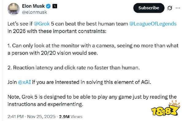 在科技飞速发展的今天,AI(人工智能)已经逐渐渗透到我们生活的方方面面,从智能家居到自动驾驶,AI的应用无处不在。在近日,“埃隆马斯克”宣布将他正在研究用AI模型Grok 5在2026年击败最强的人类LOL战队,当AI与电竞领域相遇,会碰撞出怎样的火花呢?事实上,AI进军电竞早在2017年就已上演,当时的AI发展处于萌芽时期,OpenAI便拿着对局充满不确定性的DOTA2作为训练模型。