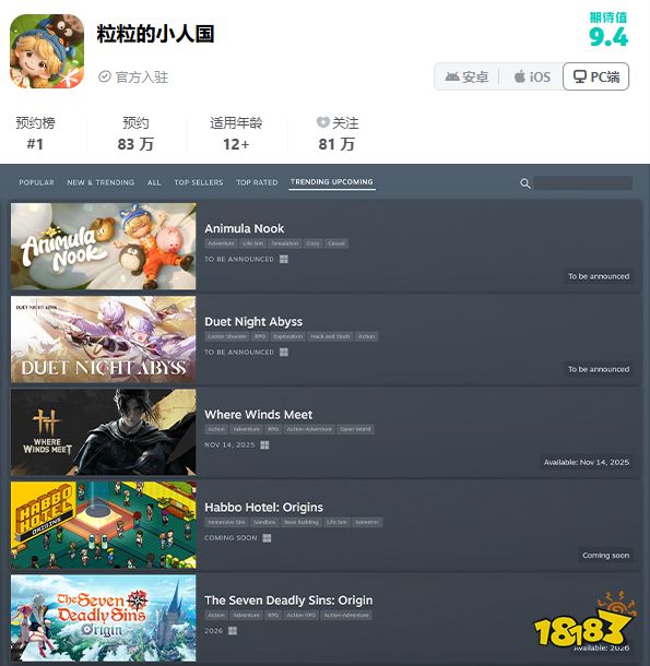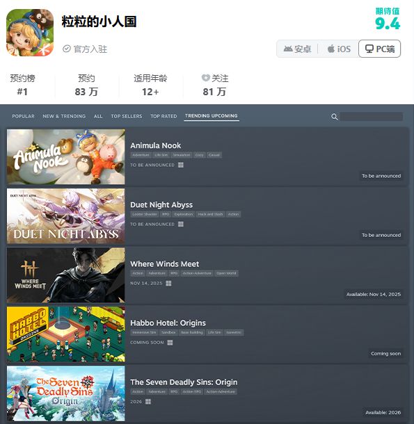 《粒粒的小人国》的首曝实机PV,像一颗投入湖面的石子,激起了远超预期的涟漪。短短数日,全网相关话题热度突破亿次,在抖音、小红书等平台热度高涨。首曝至今,TapTap平台评分稳居9.6高分,预约人数高达120万。在社交媒体上,“简直是电影级别的画面”、“这游戏也太懂女孩子的心了!”等好评络绎不绝,这足以证明《粒粒的小人国》成为了生活模拟赛道备受期待的游戏!