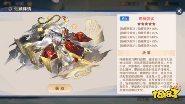 新增红色仙藏锦襕袈裟,为守护使大人带来独特战斗效果。 锦襕袈裟:首次释放仙藏技能后,立即回复一定点数仙藏怒气并使下一个行动的仙藏攻击时增加一定百分比暴击和伤害,若下一个行动的仙藏成功击败神将,则再次回复一定点数仙藏怒气。