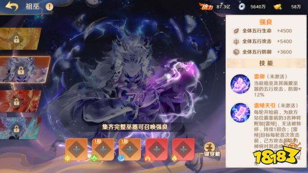 橙色新祖巫强良已经加入到游戏中,守护使集齐相应巫器即可激活。 满级强良特性:每轮开始前,为敌方全体目标附加[雷殛],无法被转移,持续1回合;[雷殛]目标每轮首次攻击前,己方攻击最高的神将对其造成一定百分比攻击的间接伤害;[雷殛]:降低一定百分比间接伤害减免。