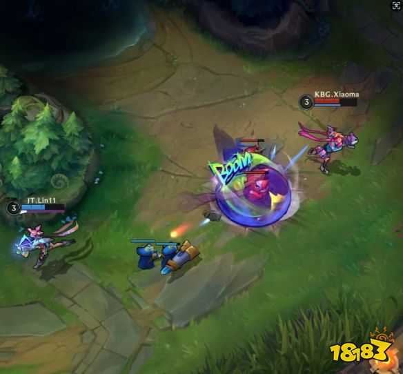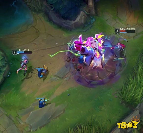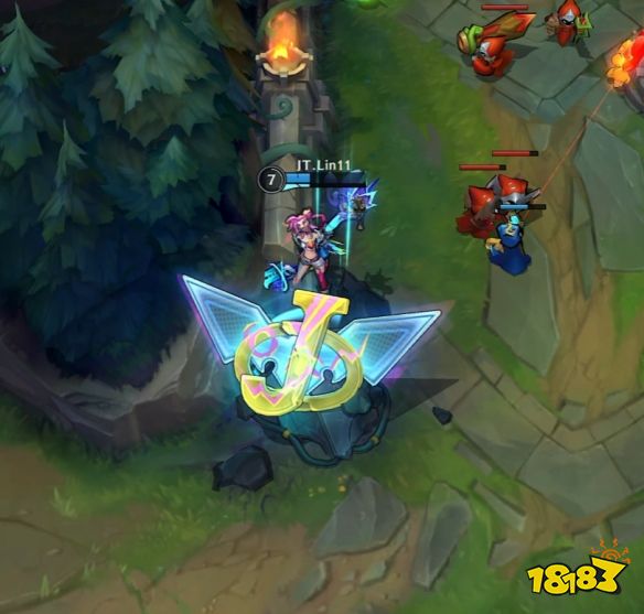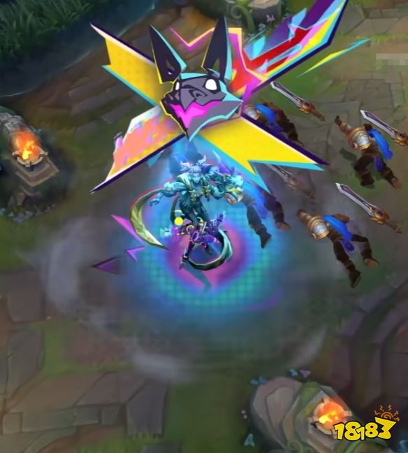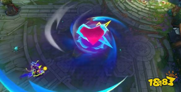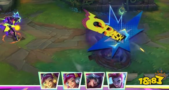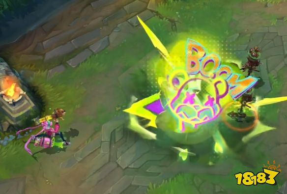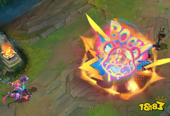 全技能的电磁科技风特效非常醒目,大招命中敌人后同样是展现金克丝的玩具小熊画像,色彩上与狂潮·裂变的差别很大。