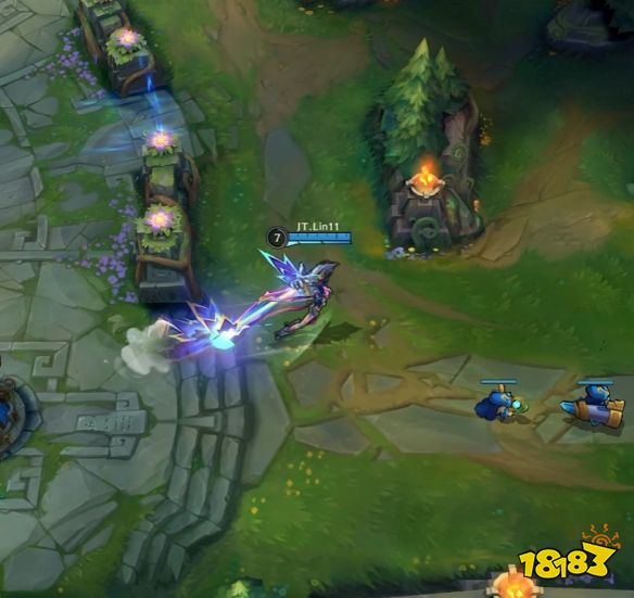 击杀敌人触发被动“罪恶快感”后,金克丝不仅会变身,更有专属BGM随之响起。而她回城的特效直接使用喷气激光从泉水出发,如同火箭升空,帅气离场。