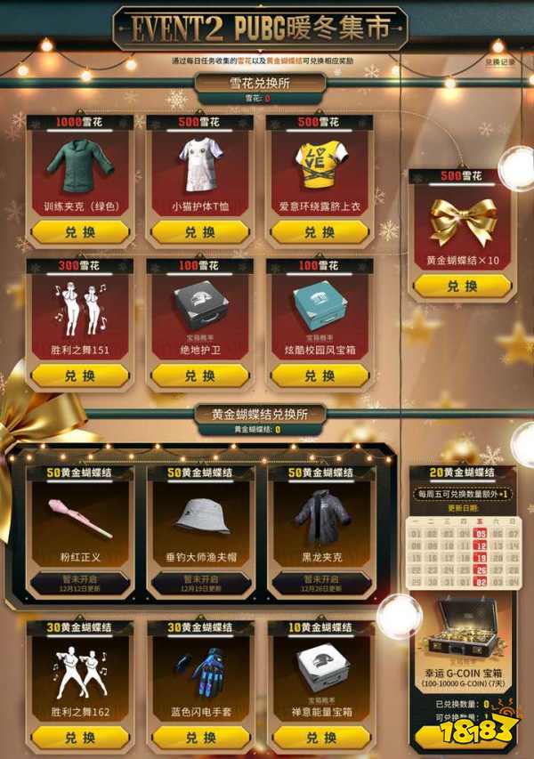活动2:PUBG暖冬集市,通过活动1所得“雪花”和“黄金蝴蝶结”可在集市中兑换皮肤和宝箱等道具,活动期间每逢周五还可额外兑换幸运G-COIN宝箱*1。此次皮肤中有火箭筒—粉红正义,帽子—垂钓大师渔夫帽,外套—黑龙夹克可供兑换,可以说穿的越粉打的越狠,穿的越少防御越高,大家可千万不要错过它们哦!