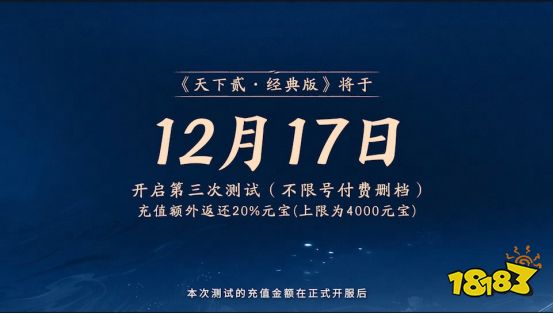 12月17日,《天下贰·经典版》将进行第三次测试,欢迎各位少侠持续关注和参与!经典版本天下贰的未来,由你们来决定!