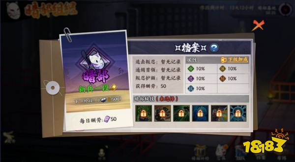 (二)档案:在活动期间会根据学员们自己的暗部等级,每日发放一份固定的酬劳,暗部头衔越高,在该玩法里的属性加成会越高,还会解锁相应的暗部秘技,让所有忍者学员大展身手,冲击更高的排名;