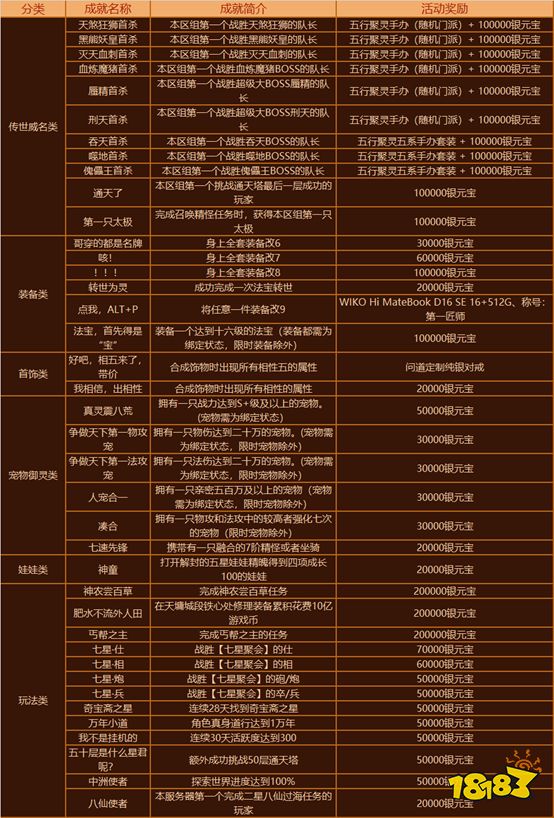 第一个达成“将任意一件装备改9”成就的玩家将赢得WIKO Hi MateBook D16 SE 16+512G笔记本电脑和“第一匠师”称号!拿下“吞天首杀”、“噬地首杀”、“傀儡王首杀”的玩家还会获得五行聚灵五系手办套装+100000银元宝奖励!还有超多活动成就只要第一个达成,就会获得问道定制手办、丰厚银元宝等对应奖励。定会让道友满载而归!