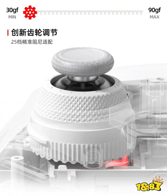 北通对可以调节摇杆松紧的阻尼环,做出了突破行业的创新。摇杆阻尼环内部搭载创新齿轮结构+专利0接触防磨损结构,转动时能感受到清晰的“咔哒”反馈,如同调节相机镜头一样,可以一格一格精准调松紧。