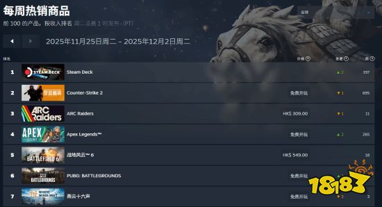 2)11月18日至12月2日,游戏连续三周进入Steam周销榜,名次不断上升。