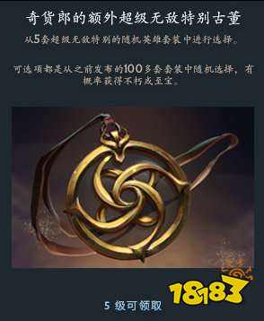 开启奇货郎的古董,玩家有机会随机得到100多套往年推出的英雄套装中的一套,也有较小概率能获得一件不朽饰品或者至宝饰品。其中,5级的奖励是“奇货郎的额外超级无敌特别古董”,玩家可以从5套超级无敌特别的随机英雄套装里进行选择,这些可选项都是从之前发布的100多套套装中随机挑选的,还有一定概率能获得不朽或至宝。