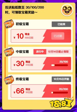 投送贴纸除了可以为游戏家和俱乐部助力以外,也可以解锁现金红包领取资格。中级宝箱正在火热领取中,投送贴纸满100张即可抢领30元现金红包;12月15日将开启终极宝箱,投送满200张贴纸可领取66元现金红包!