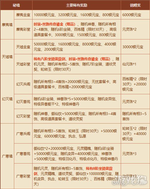 探索中,珍宝分为仙品(金色光圈)、珍品(粉色光圈)与凡品(无光圈),更有秘境之灵馈赠的锦鲤奖等你解锁!