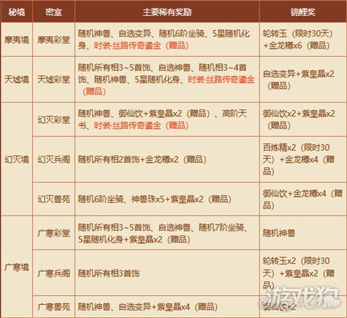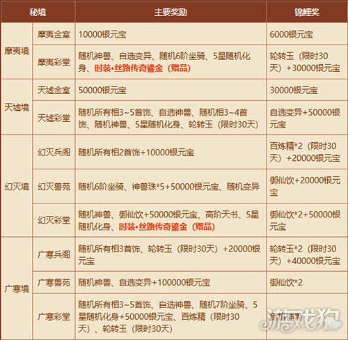 本次破阵探宝活动设有摩夷、天墟、幻灭、广寒四大秘境,每个秘境根据密室不同藏匿着不同类型的珍宝。玩家可使用破阵符(200金元宝/200破阵积分购买1张)开启秘境探索之旅。参与活动自动生成【纳戒】,并将获得活动奖励道具放入其中,破阵积分可通过出售【纳戒】中道具获得。