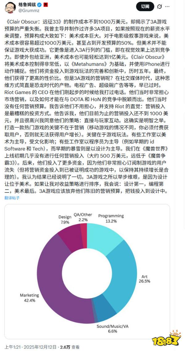 TGA 年度最佳游戏《光与影:33号远征队》的开发预算竟然不足 1000 万美元, 远低于动辄数亿的大型 3A 项目。开发商 Sandfall Interactive CEO Guillaume Broche 在采访中披露了低成本背后的原因:不采用开放世界、小团队结构、成熟 JRPG 管线。