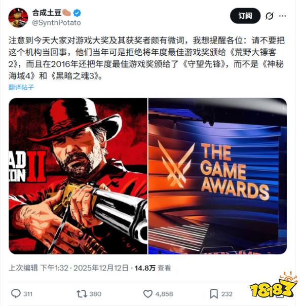 随着 《光与影:33号远征队》 拿下 2025 年 TGA 年度游戏,网友也整理出了 过去十年(2016-2025)获得 TGA 年度最佳游戏的完整名单。 如果从这十款里重新选一次,你觉得谁才是最强 GOTY?