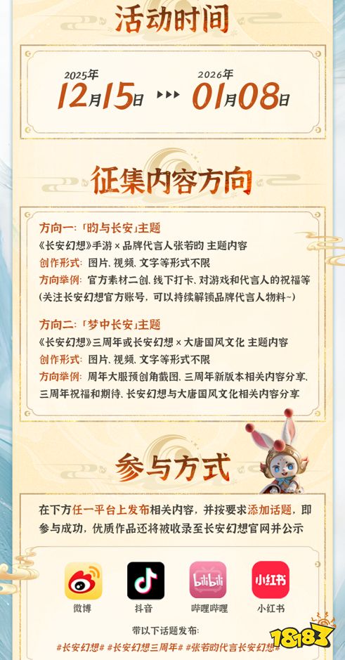 游戏外,UGC二创活动也在全平台开启。围绕《长安幻想》手游品牌代言人张若昀方向或《长安幻想》三周年及长安文化,在微博、抖音、B站、小红书任一平台上分享相关内容,并添加指定话题,即可成功参与活动,有机会获得代言签名照、代言周边、华为手表、华为耳机等奖品。