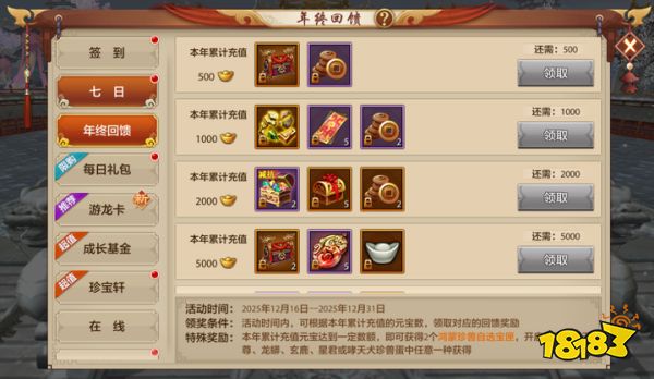 时光荏苒,情义长存。2025年年终感恩回馈活动现已温情启幕,诚邀各位少侠共赴这场岁末之约!12月16日至12月31日期间,愿以真挚回馈,致敬每一段并肩江湖的时光。