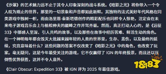 而在更深层面,IGN认为真正让《光与影33号远征队》留下强烈印记的,是其情感共鸣极强的故事与角色群像:在一个神祇每年都会抹杀大量、且越来越年轻生命的世界里,“生存”“哀悼”与“继续前行”的意义被反复拷问,并以角色的挣扎与选择回击玩家。评语称,它不仅赢得了年度投票,而且是以压倒性优势夺冠。