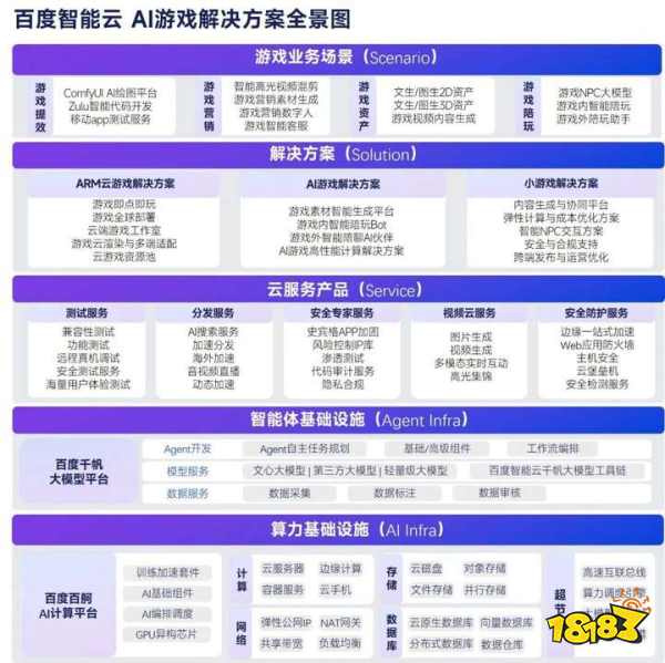 百度智能云围绕游戏研发提效、游戏营销、游戏资产生成、游戏陪玩四大板块,联合行业合作伙伴提供AI能力,是最早推出完整游戏行业AI解决方案的云厂商,成为全栈游戏AI云的代表性平台。
