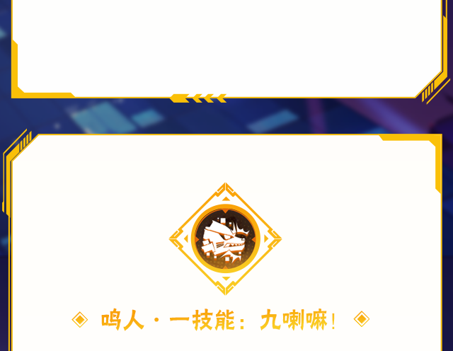 鸣人登场时二技能共两段,点按释放一段,鸣人的尾兽外衣将形成一双大爪。黄条结束前可释放二段,鸣人瞬身突进抓取敌人,随后挥拳将敌人大力击飞。