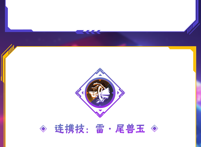 鸣人或佐助任意一方登场时,在二技能后摇点按奥义,将会消耗一颗奥义点,召唤对方一起打出连携技:雷·尾兽玉,鸣人凝聚尾兽玉,佐助召唤麒麟,两股力量合而为一向前发射,将敌人贯穿。结束后同样将自动切换为另一角色,并进入强化状态,使用任意技能后强化结束。