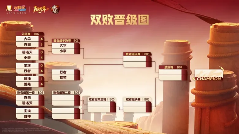 年总无差别瑞士轮分组赛中,大伞、小豪、行者、荒芜成功进入胜者组;真白、碧洛天、尘埃、鼬神则落入败者组。