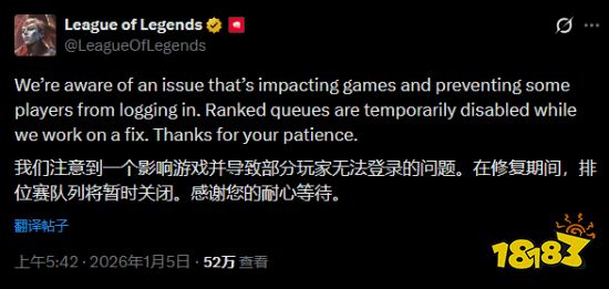 《英雄联盟》官网发布公告称,为保障服务器运行稳定,游戏已于2026年1月5日凌晨5点左右对全区进行临时停机维护。维护期间,玩家将无法登录游戏,相关影响覆盖全区服务。