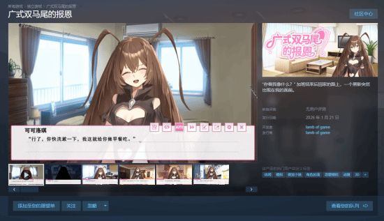 《广式双马尾的报恩》凭借其将民俗元素与现代生活结合的有趣设定,在Steam平台引起了部分玩家的关注。游戏将于1月21日正式解锁,为喜好视觉小说的玩家提供一个风格独特的休闲选择。