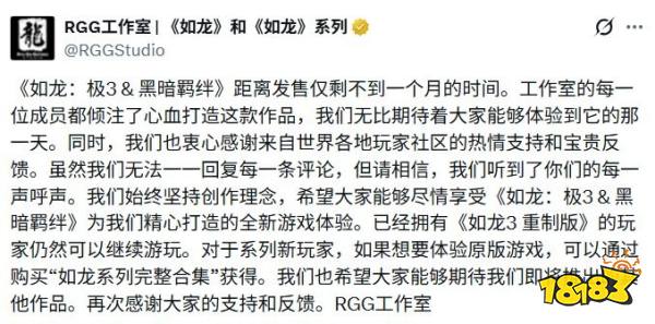 此次公告发布之际,正值系列新作《如龙 极3》与《外传Dark Ties》即将推出。如龙工作室称即将到来的项目是团队倾注了大量心血的作品,并希望玩家能享受其所设想的“全新体验”。声明最后鼓励粉丝期待新作,并再次感谢玩家的支持。