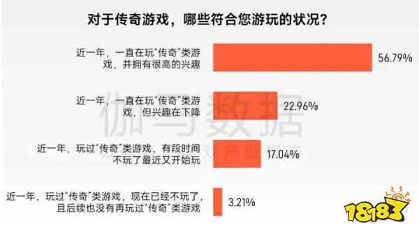 活跃用户中仍有56.79%表示一直在玩“传奇”类游戏,并保持较高兴趣;仅3.21%的用户表示已彻底放弃且不再关注