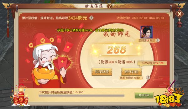 2月1日至3月3日,开年福利活动「财运滚滚来」火热开启。海量绑元拿不停,更可领取喜庆又俏皮的发型【财多多】——让你从年初到年尾,做江湖中最受眷顾的好运之星~