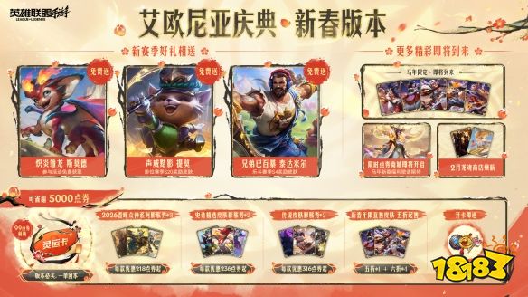 版本更新至春节期间内,官方奉上了超级丰厚的年度级福利,随着新赛季开启,参与排位赛季、乐斗赛季拿下两款赛季主题皮肤。紧接着在春节期间会推出新春签到活动,你将可以获得马年限定赫卡里姆及各色炫彩皮肤,同时在新春签到活动及传奇图集活动中还可获得大量限时点券,免费兑换包括 2026全新臻宝皮肤“流光仙韵 莫甘娜 完全体”在内的多款高价值限定奖励!福利涵盖神话、传说、史诗皮肤免费自选,数千限时点券,正常活跃登录签到领取,不伤“肝”!