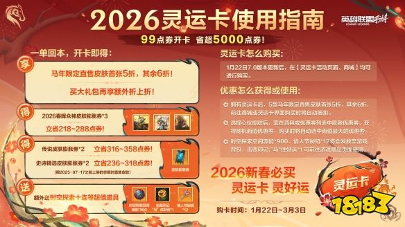 版本必买的“灵运卡”,更是每一位召唤师不容错过的全新福利,无论是抽奖、买春晖皮肤还是买全套年限,它都是各位不容错过的顶级折扣卡。
