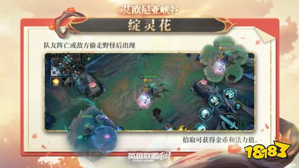 当英雄被击败,或自家野区野怪被对手夺走,此处便会有一朵绽灵花生长,为拾取它的队友提供阵亡者的能量。在中路,来自山谷的风场能为中单英雄提供些许移动速度加成,让各位在游走和转线支援时更加从容不迫、游刃有余。