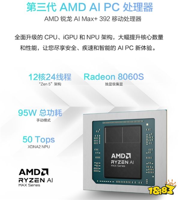 华硕天选Air 2026锐龙AI Max版搭载AMD 锐龙 AI Max+ 392处理器,基于4nm制程及“Zen 5”架构打造,12大核24线程,最高加速频率达5.0GHz。内置RDNA 3.5架构Radeon 8060S集显,具备40个计算单元,图形性能达到现代独立显卡水平,满足生产力、AI、大型游戏等性能需求。