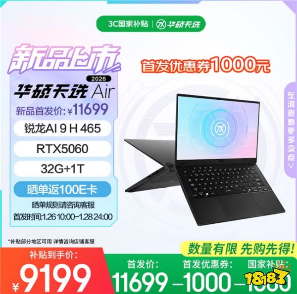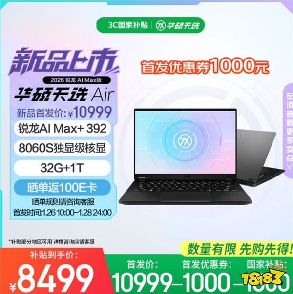 1月26日上午10点,全新14英寸高性能轻薄本华硕天选Air 2026系列全面开售,本次新品包括天选Air 2026锐龙AI Max版与天选Air 2026两个版本。1月26日上午10点至1月28日24点首发活动期间,天选Air 2026系列新品享1000元首发优惠券与1500元国补优惠,最低到手价8499元,晒单还可返100元E卡,切勿错过。