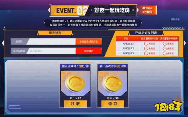 活动2:好友一起玩吃鸡,活动期间,与你的好鸡友绑定游戏朋友关系并一起完成时长任务,可以最多绑定3位好鸡友,至少与1位好鸡友共同完成任务,即可领取积分,积分会在2月15日上午10点—2月23日 上午10点春节假期期间翻倍哟!